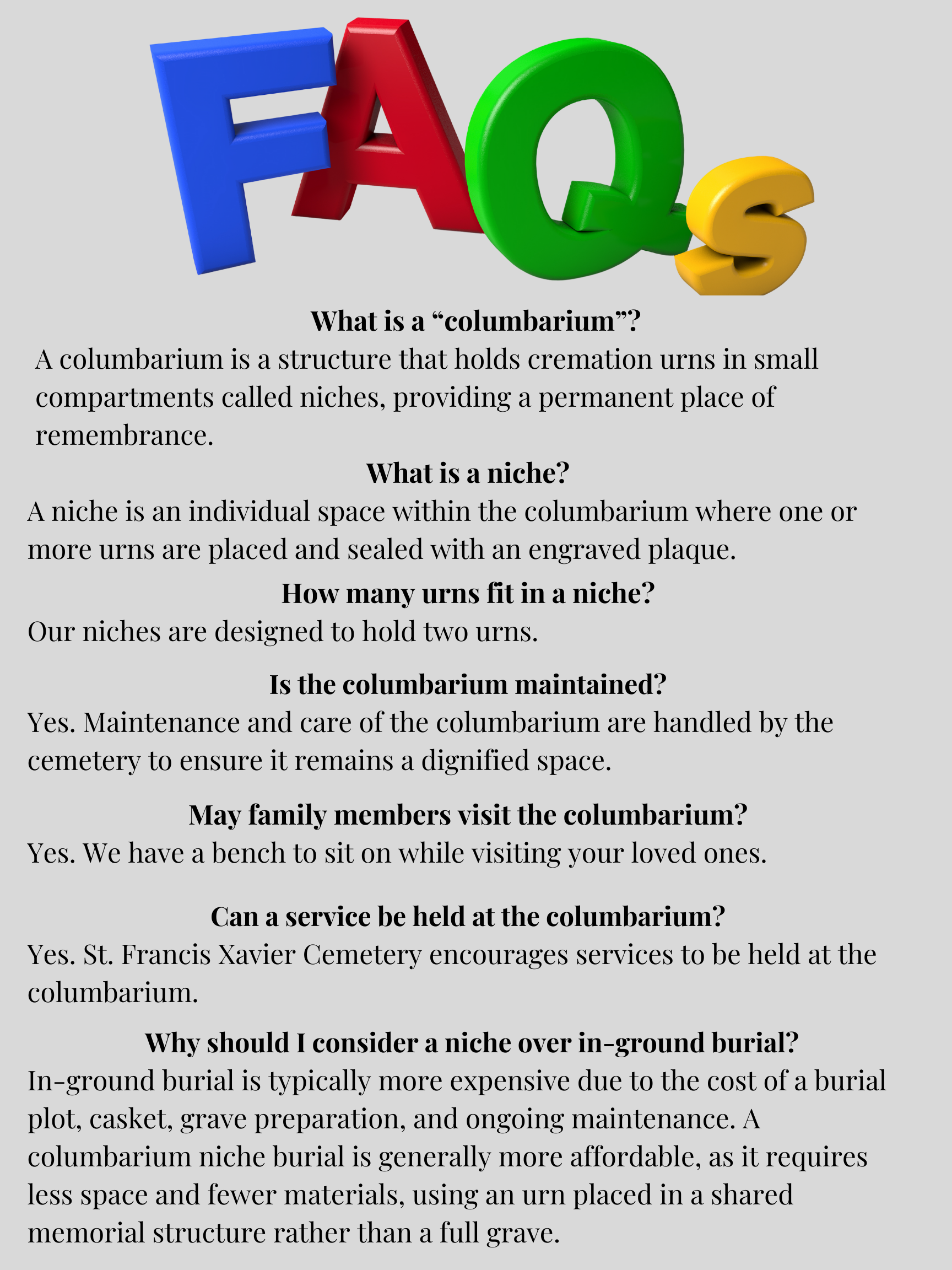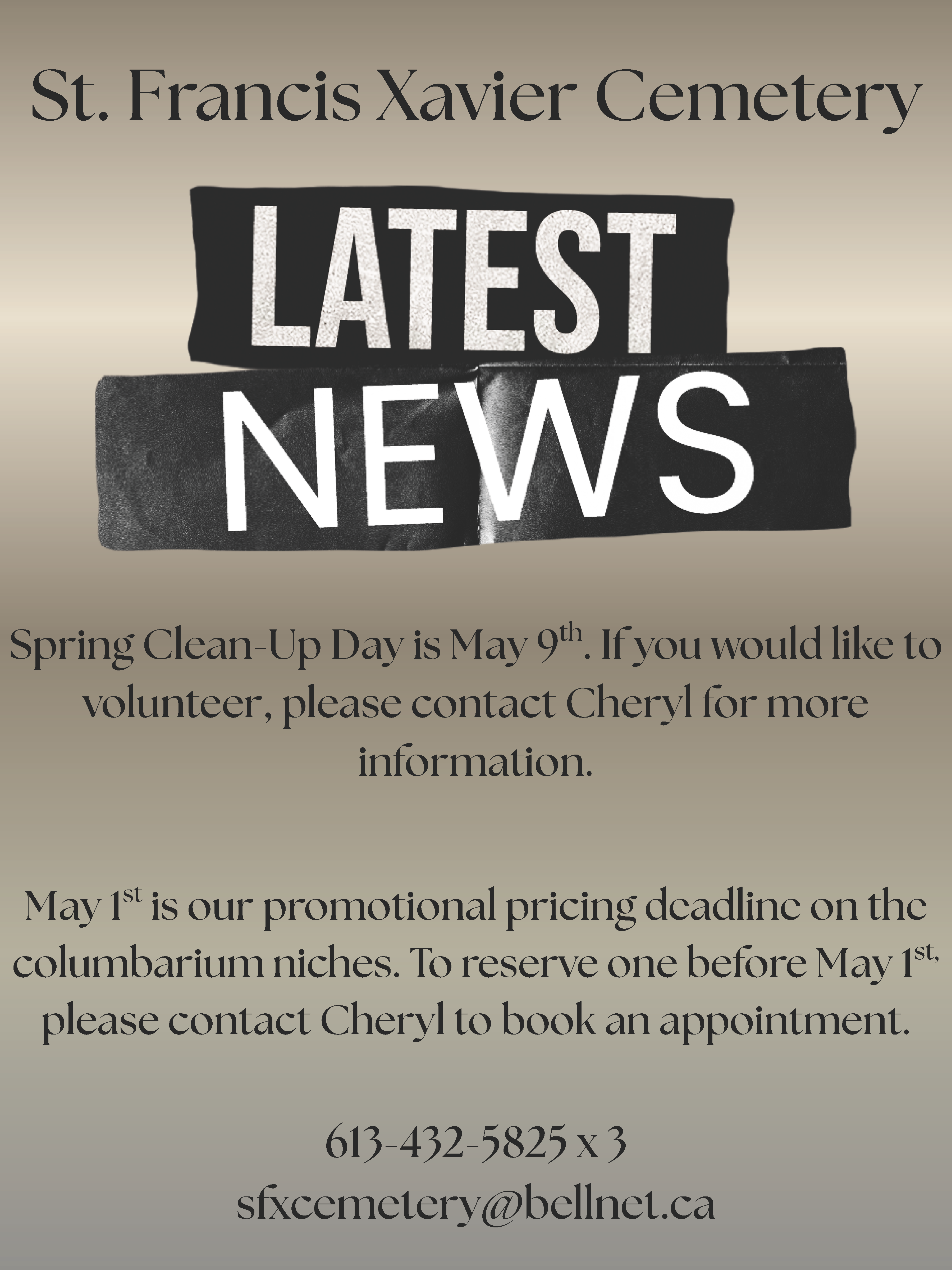 St. Francis Xavier Cemetery installed a 48-niche columbarium on October 30, 2025. We are offering promotional pricing until May 1st, 2026. Please contact Cheryl at 613-432-5825 x 3 or at sfxcemetery@bellnet.ca.